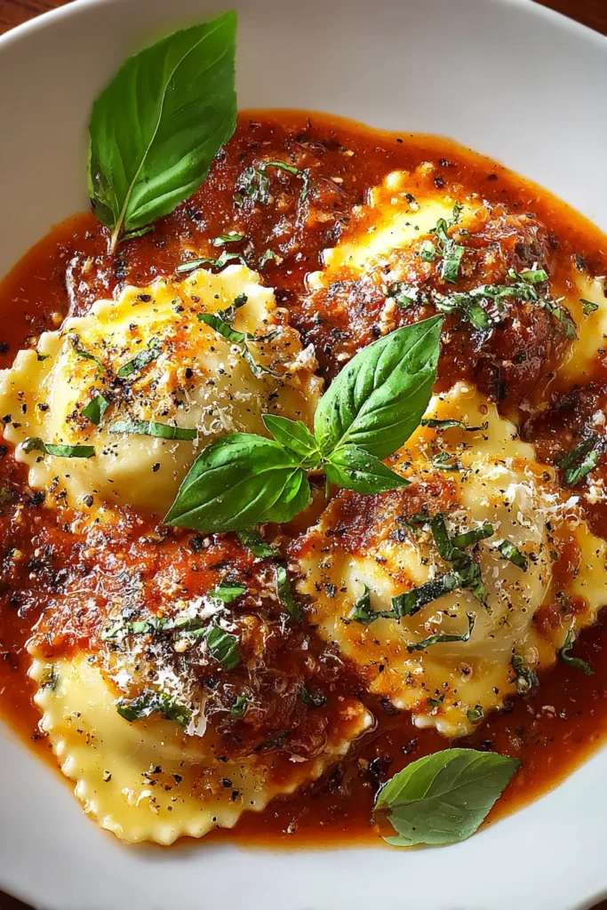 8. Serve the sauce over freshly cooked ravioli and garnish with fresh basil leaves. The moment the warm, cheese-filled pasta meets this sauce is pure Italian comfort on a plate.